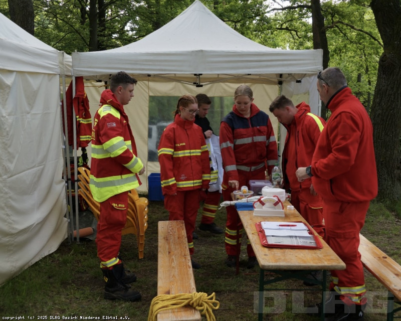 Am Samstagmorgen starteten wir mit einem gemeinsamen Frühstück bei uns auf dem Vereinsgelände. Danach machten uns gemeinsam auf den Weg und begannen zunächst mit dem Aufbau unseres Sanitätszelts und unserer Posten für die zwei Tage. Unsere drei Wassertrupps wechselten sich so ab, dass immer ein Team Pause hatte und zwei Teams die beiden Posten besetzten. Teilweise nutzten wir auch unsere Drohne, um den See zu überschauen und zu sicheren das niemand unbefugt den See mit einem ausgeliehenen Boot verlässt.